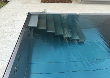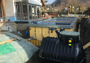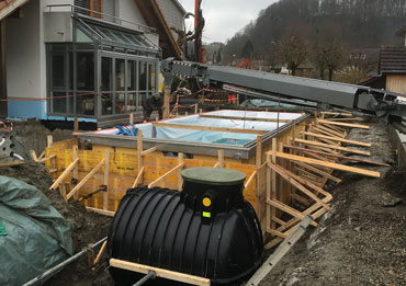 Vorgefertigter Überlaufpool Abschalung für Überlaufpool-Hinterfüllung Hinterfüllung mit Geröllbeton 16/32 200er Überlauf Chromstahl-Treppenabgang